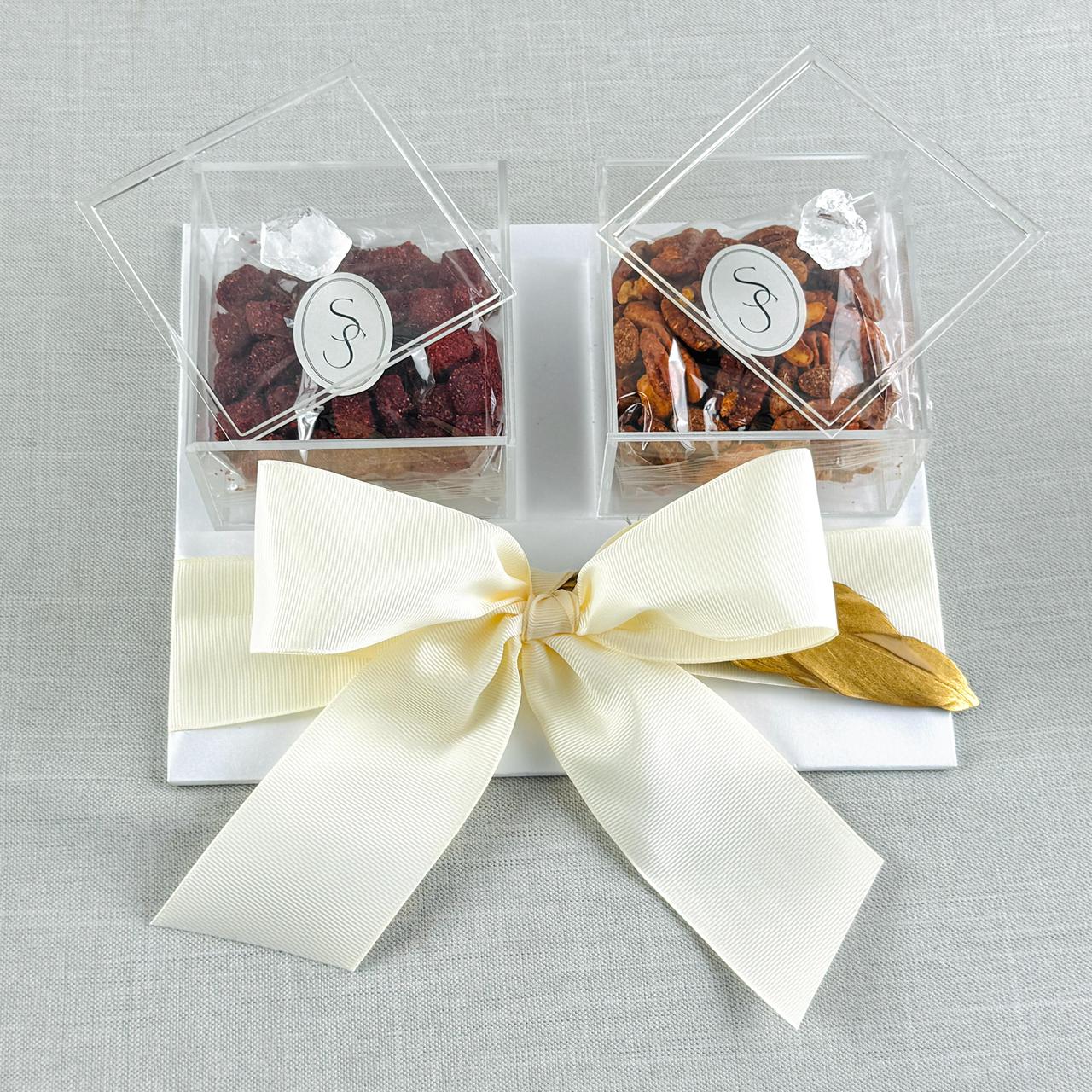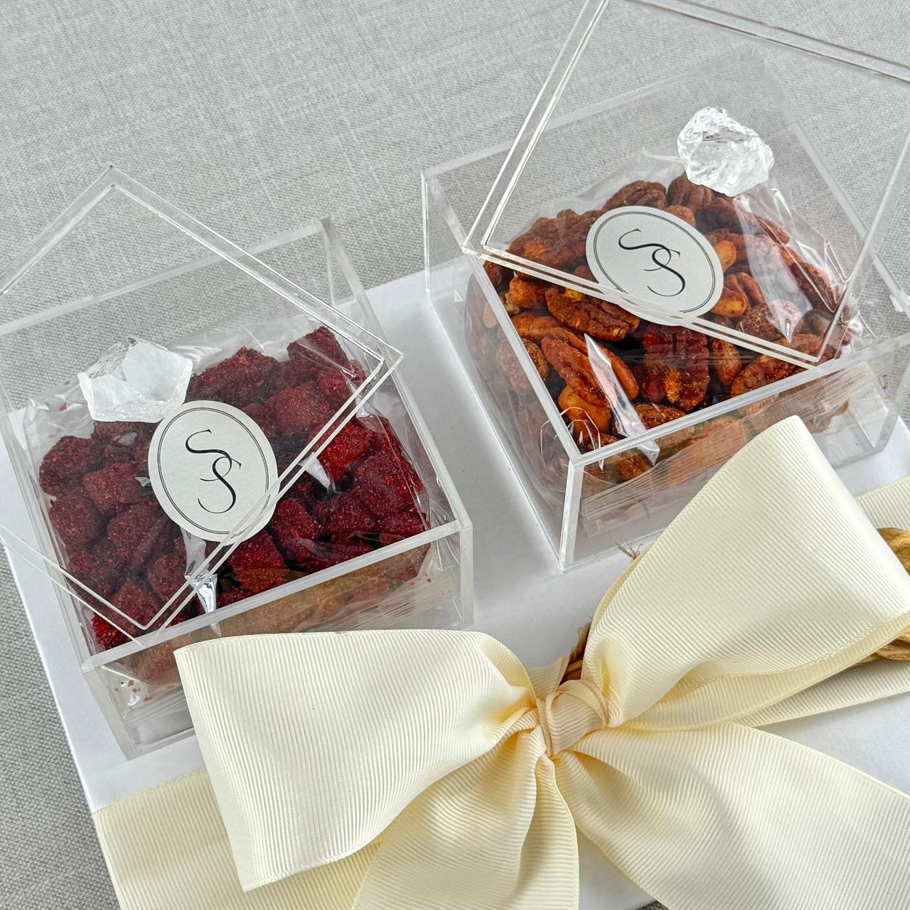Caja de acrílico con cuarzo (10×10 cm) y botana a elegir: almendra enchilada, ate enchilado o mix enchilado.