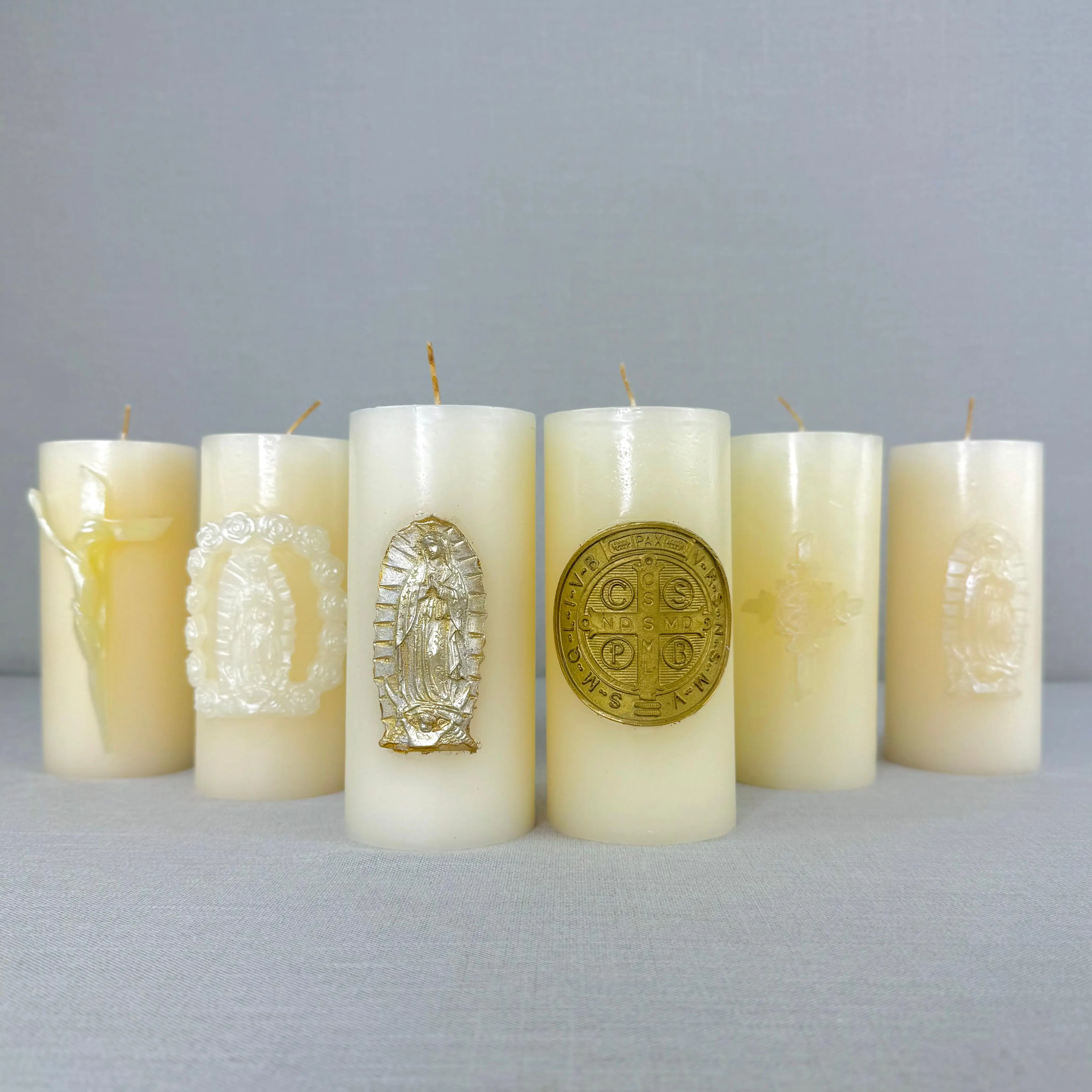 Este cirio de 15 cm de alto por 7 cm de ancho es ideal para ofrendas, altares personales y ceremonias religiosas. Elaborado en parafina de alta calidad, está disponible en modelos que representan símbolos significativos de fe y devoción: