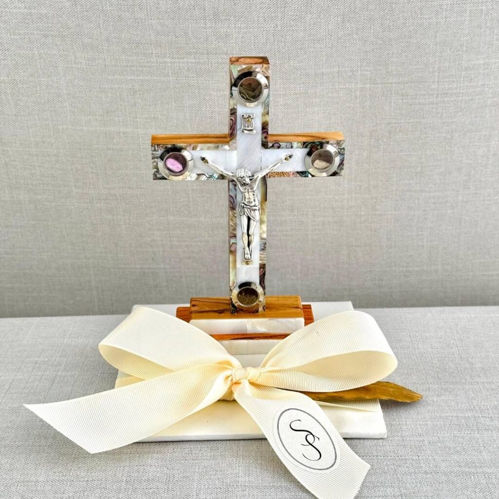 Cruces de madera de olivo de Tierra Santa con madre perla, que incluyen reliquias auténticas (olivo, incienso, tierra y flor de Belén) en las cuatro esquinas. Disponibles en dos tamaños.
