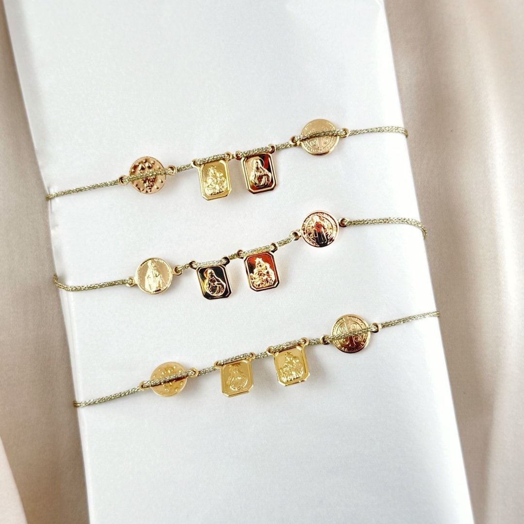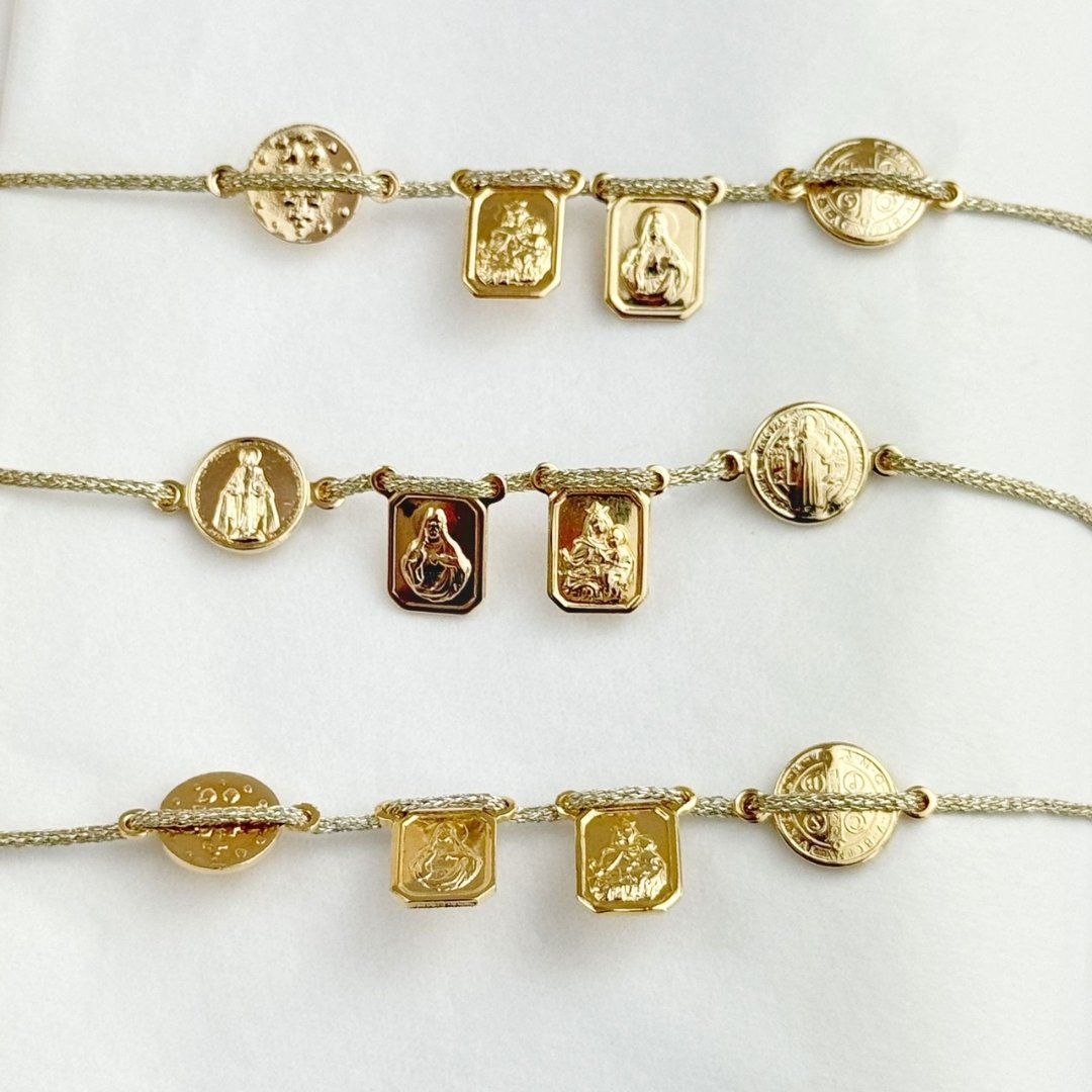 Elegante pulsera de escapulario elaborada en material gold plated, un detalle lleno de fe y protección. Incluye la imagen de la Virgen Milagrosa y de San Benito, símbolos de luz y resguardo espiritual