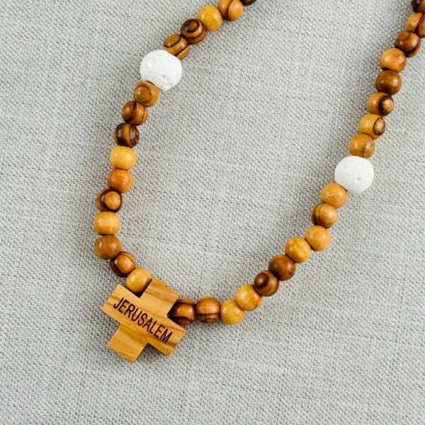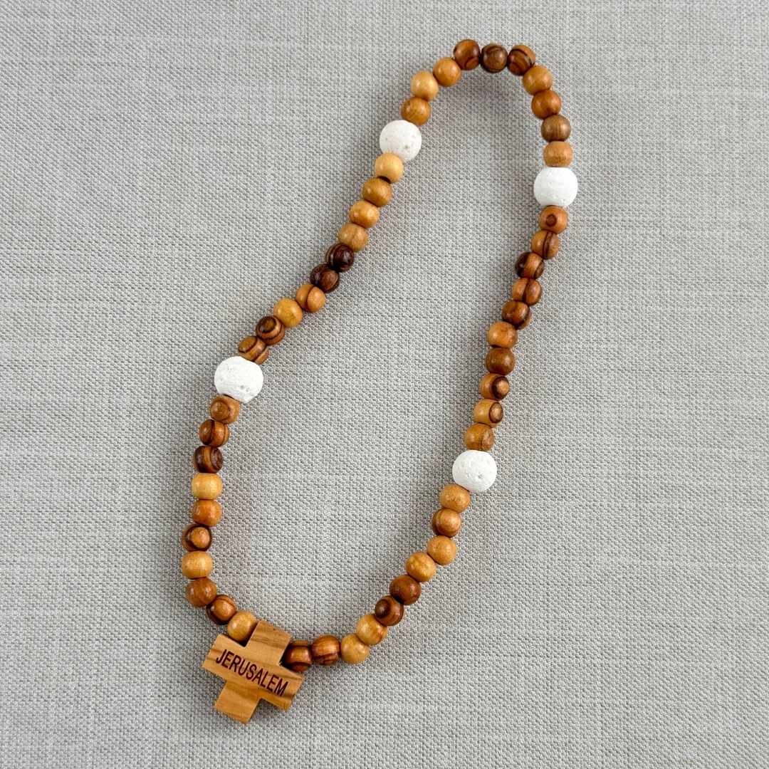 Rosario hecho con madera de olivo de Tierra Santa, disponible en tres colores azul, blanco y café.