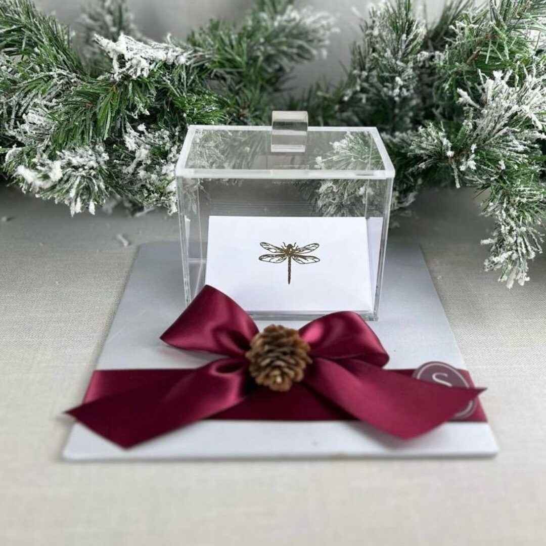 Caja práctica y elegante elaborada en acrílico transparente, con cierre de botón para mayor seguridad. Ideal para guardar tarjetas.